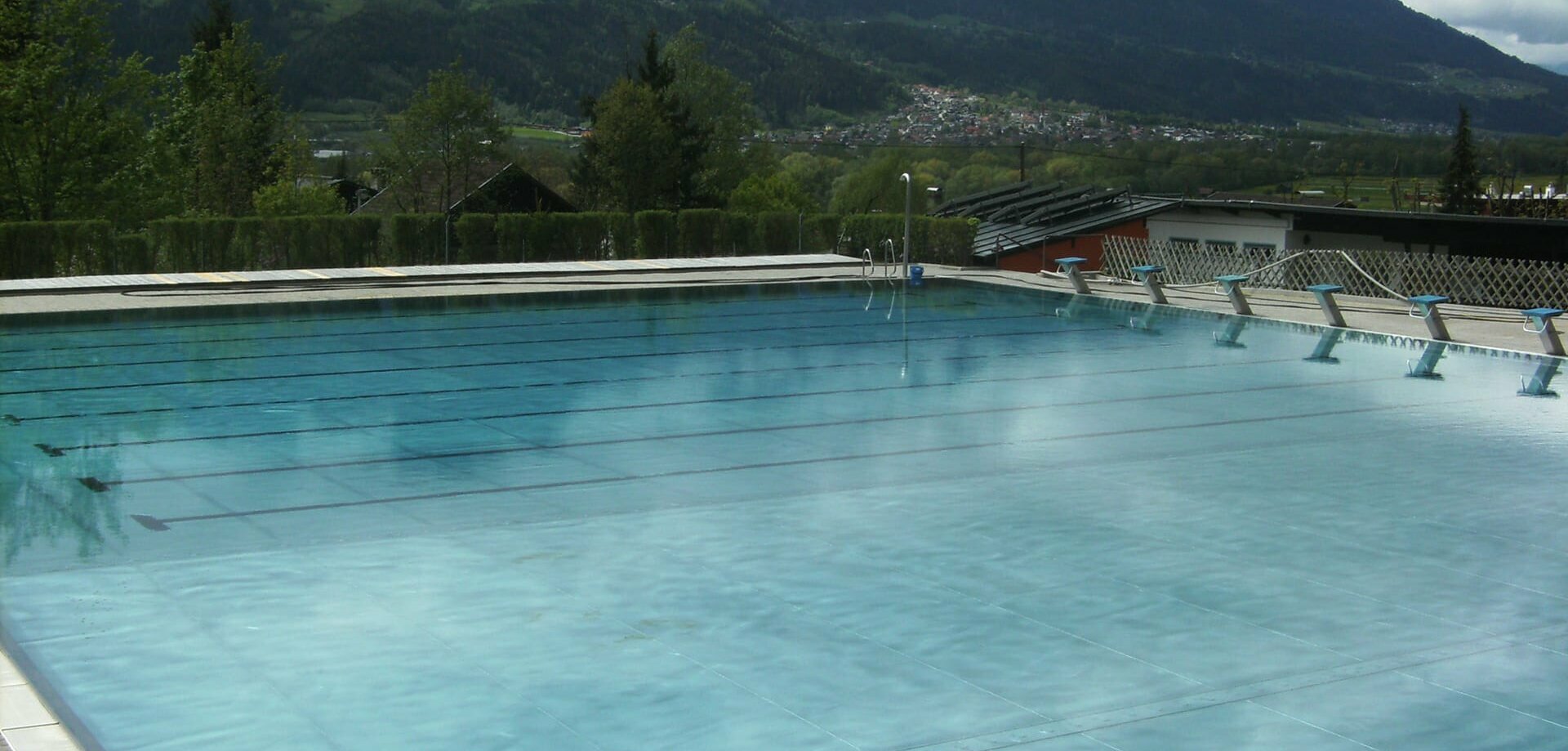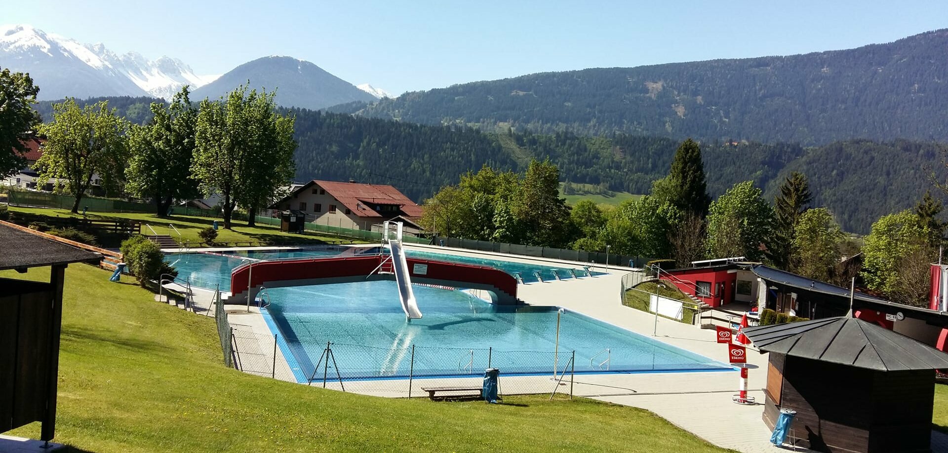 Eine große, gepflegte Liegewiese mit altem Baumbestand, im Mittelpunkt ein optisch reizvolles, solarbeheiztes Wasserbecken mit Rutsche: Die Anlage des Freibades Zirl am Fuß der Ruine Fragenstein ist ein beliebtes Sommer-Ausflugsziel für die ganze Familie.