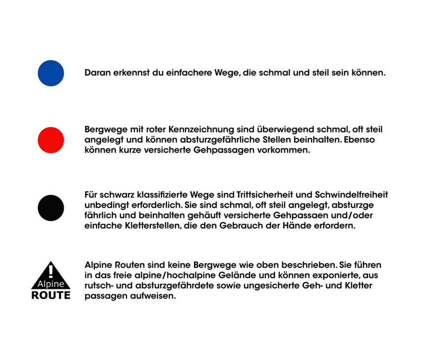 Eine gute Tourenplanung ist für jeden Ausflug auf den Berg essentiell wichtig, um wieder gesund und zufrieden zurück nach Hause zu kommen. Ein wichtiger Bestandteil davon ist es, dein Können und deine Kondition richtig einzuschätzen und danach den richtigen Weg für dich zu wählen. Dabei unterstützt dich die Klassifizierung der Wanderwege in ihre Schwierigkeitsgrade. Kriterien für die Beurteilung sind die Breite, Neigungsverhältnisse und Absturzgefährdung, die Häufigkeit der Seilsicherungen und die Häufigkeit sowie Schwierigkeit von Kletterpassagen. Auch der Gebrauch der Hände zur Aufrechterhaltung des Gleichgewichtes oder die Schwierigkeit des Weges in Bezug auf das nötige Maß an koordinativen Fähigkeiten spielt eine Rolle. Gut zu wissen ist auch, dass die Beurteilung der Wege gute Weg- und Wetterverhältnisse voraussetzt.